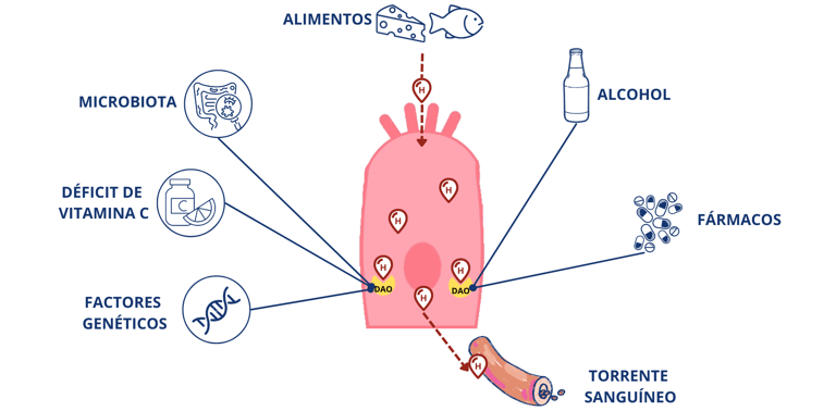 Exceso de alimentos ricos en histamina o liberadores de histamina: Algunos alimentos tienen alto contenido de histamina y otros tienen algunas aminas (cadaverina, putrescina y tiramina, principalmente) que pueden hacer que nuestras células liberen más histamina y dificulten la producción de DAO.